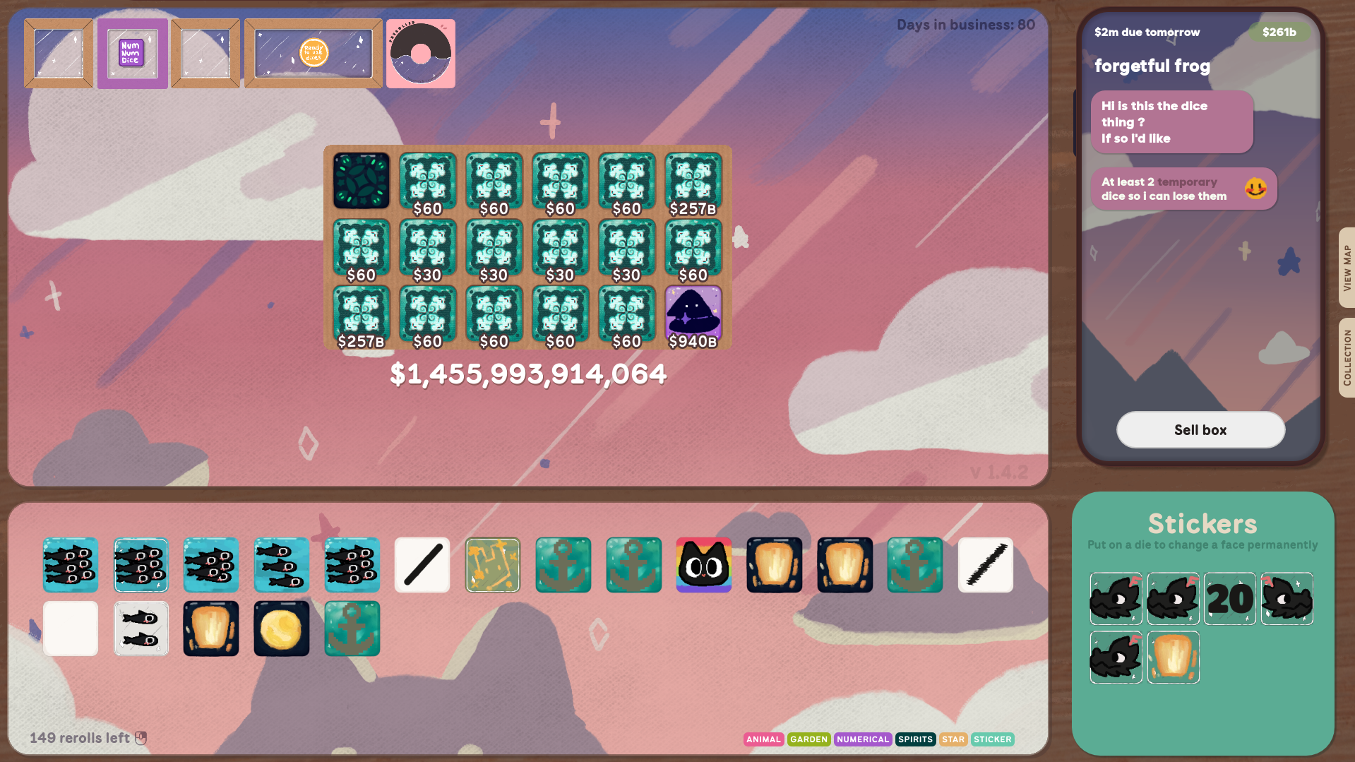 By my estimation, I could reach the double precision limit in 330 more in-game days (writing from day 118; I am not actually going to do this). The graph in the pause menu displays points okay but the labels don't render correctly (I think they use 64 bit integers). The best box number is cut off on each side... and global stats are similarly nonfunctional. Maybe it would be better for these to use scientific notation above 1e15?