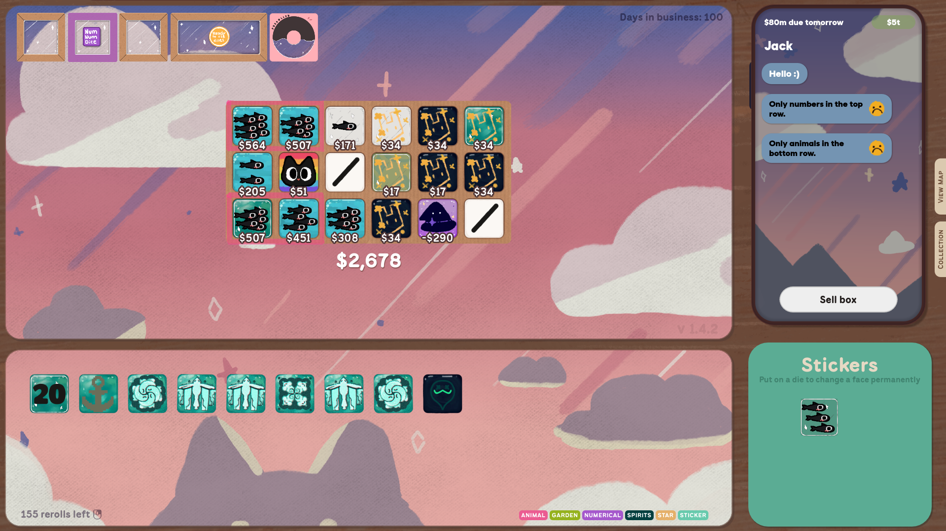 Heres my main setup, the cat provides 2-3 guardian cards per box sold. The constellations provide as many rerolls as I could ever need, and the hat thing decreases in value each turn by 8. The dividers serve to double up both the hat, and the cat. With my boxes special abilities, the edges are doubled in value, and the temporary cards stick around until they are used.