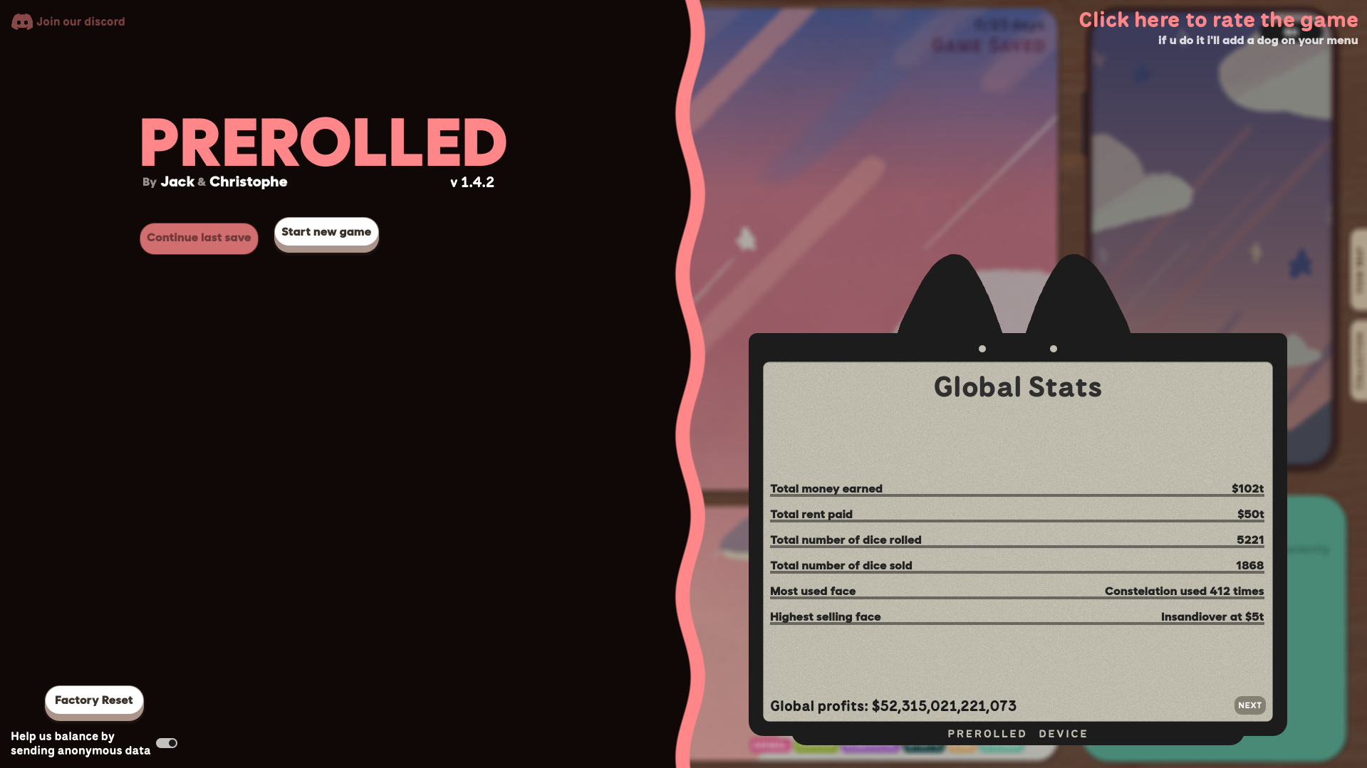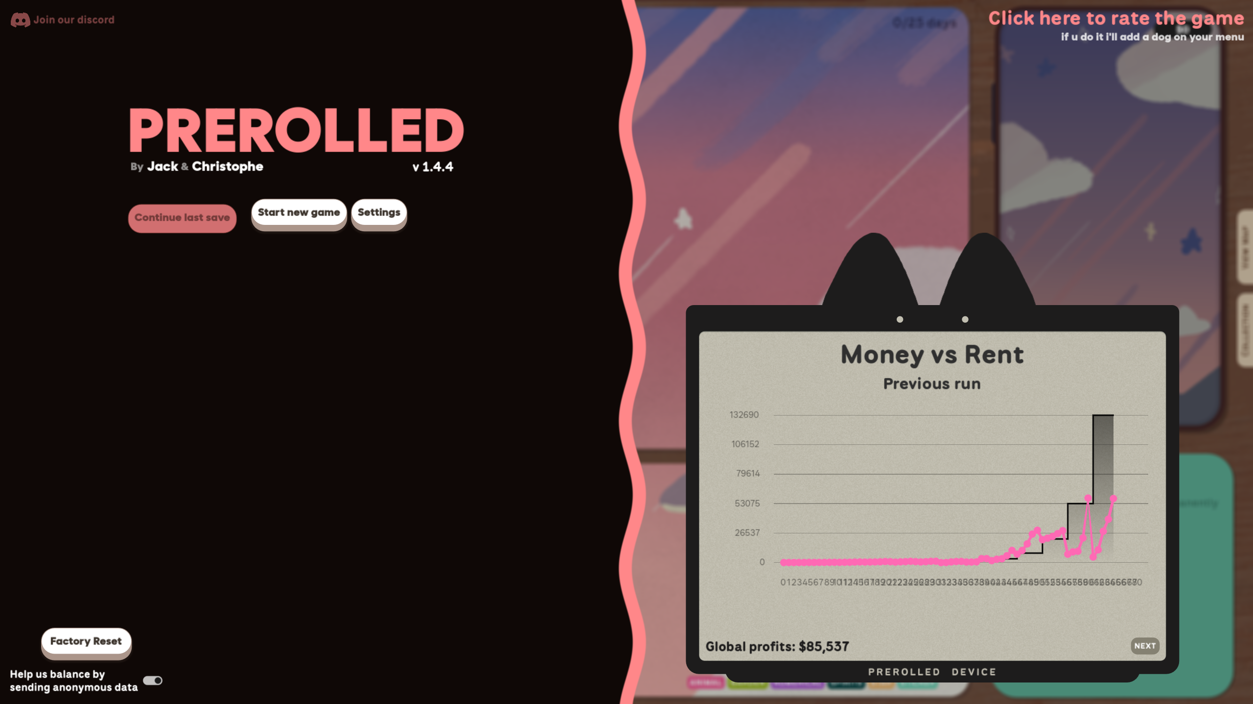 idk if it's because I forgot to turn the difficulty back up to max after grinding for $, but at least on normal the endless mode rent increase amount seems to be quite easily outpaced by the +10%/dog upgrade. Seems like I about double my income every level, but rent barely seems to quadruple per loop, which means I'm still paying thousands on day 51 but I've got over 1 trillion in the bank, which makes making more money feel kinda silly.